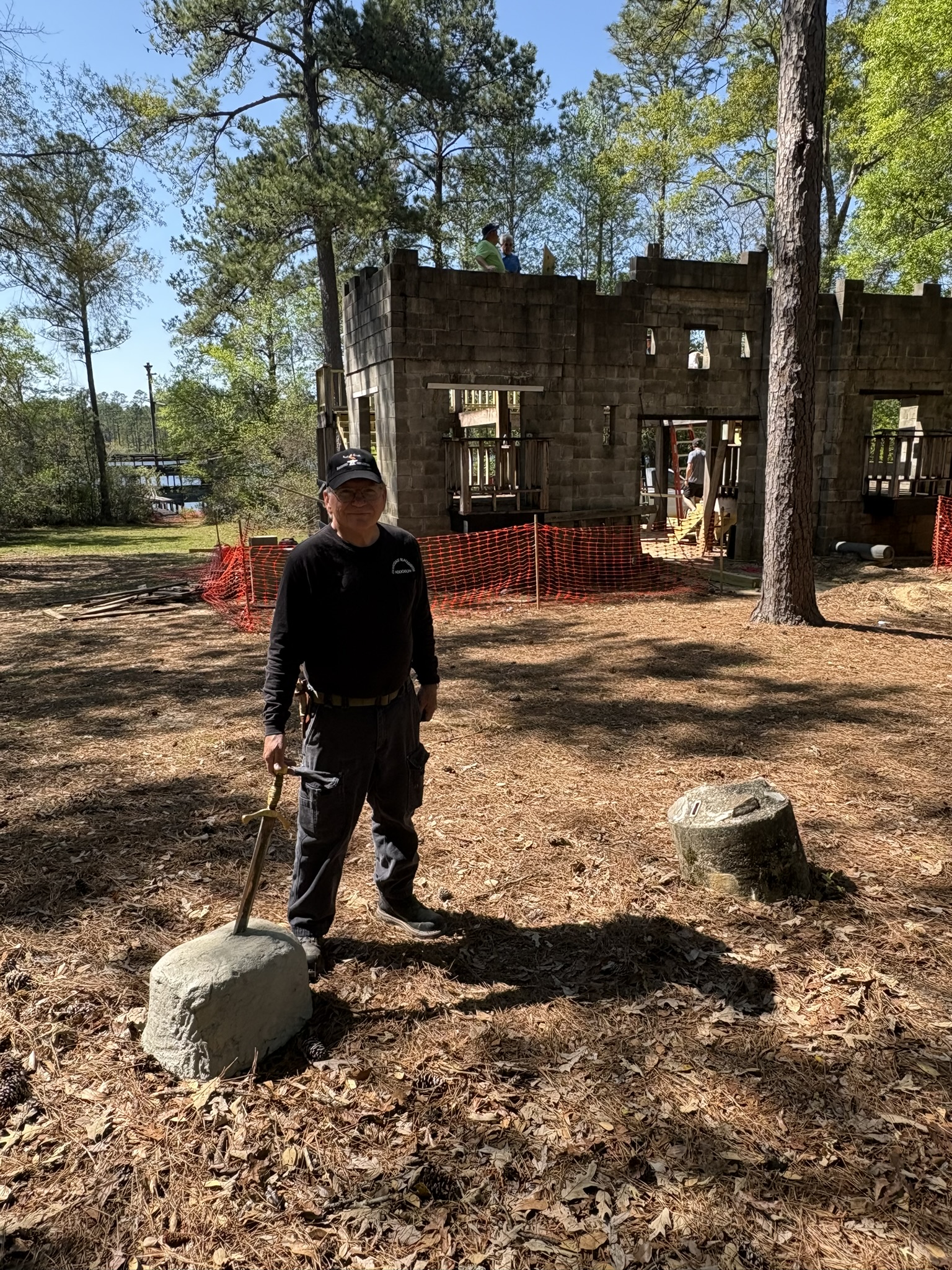 Several other volunteers led by Mike Decossas of Troop 18 and Ken Hays of Troop 231 trenched and installed conduit in preparation for bringing fiber optic wire to the front of camp for internet and other uses. A group of volunteers from Troop 269 and Pack 117 also continued work on the Castle for a tentative re-opening at Cub World. And, Bob Meyers, a member of the Gulf Coast Blacksmith Association, delivered a new sword in the stone fabricated and donated by him for the Castle. Thanks to all of the volunteers who continue to donate their time to make Camp V-Bar better!